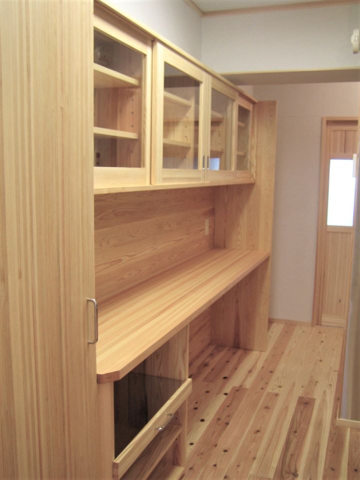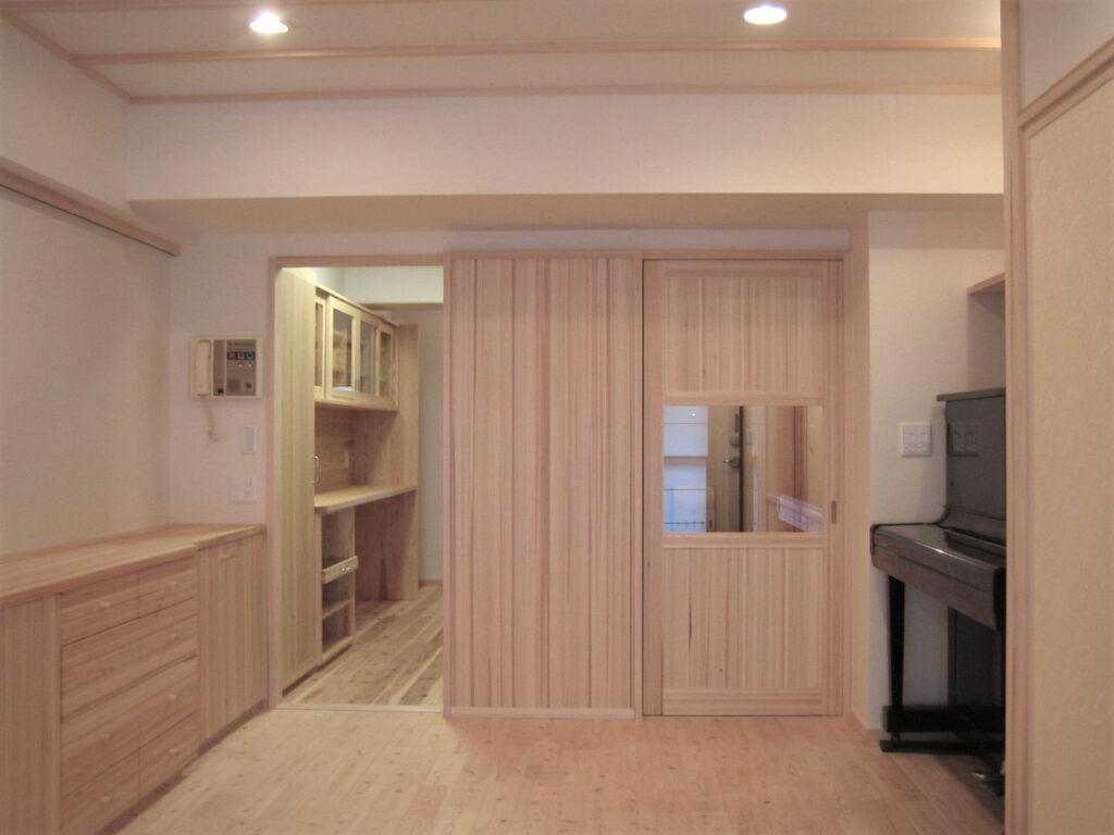 台所(リフォ-ム後):造り付収納家具は桧材で製作・正面奥の引き戸は通風を兼ねています