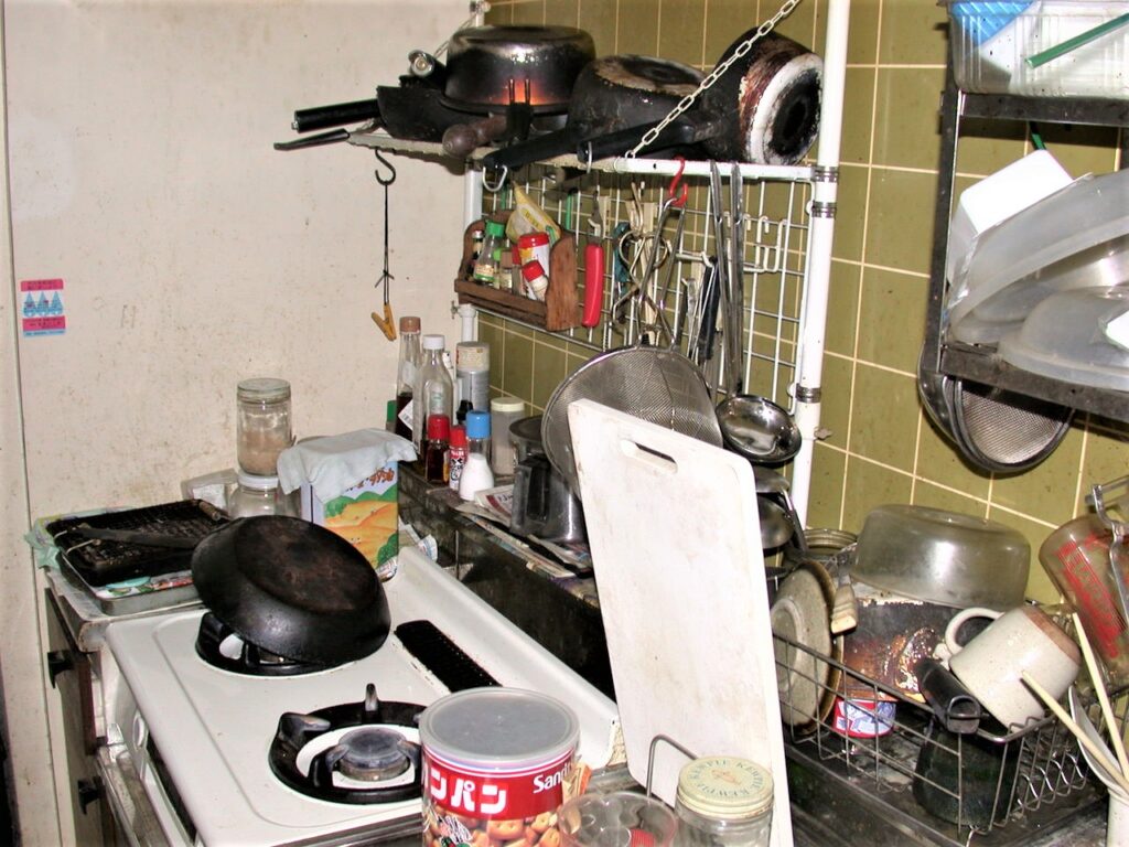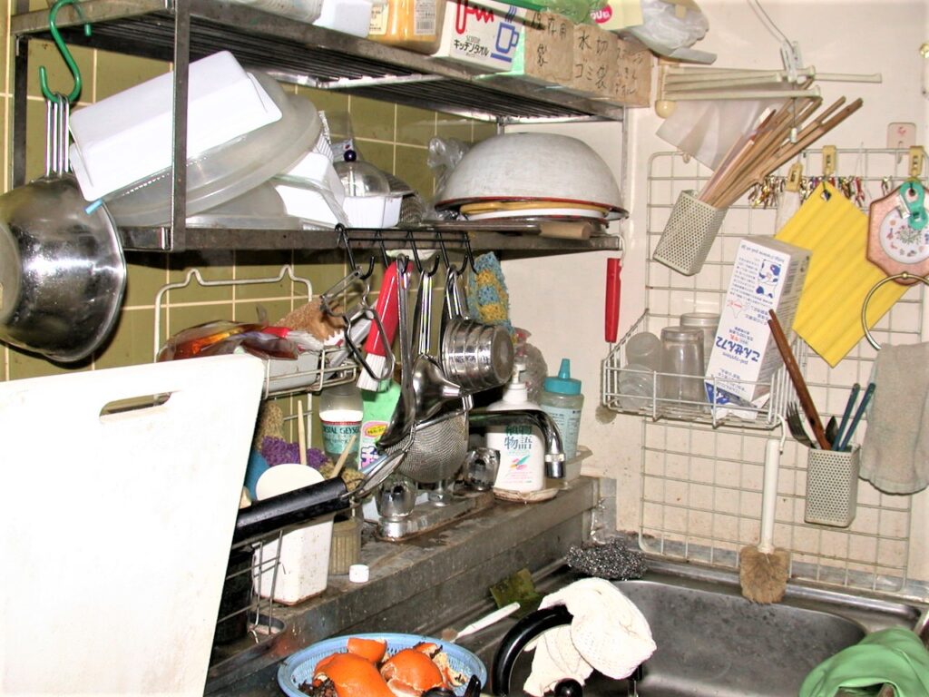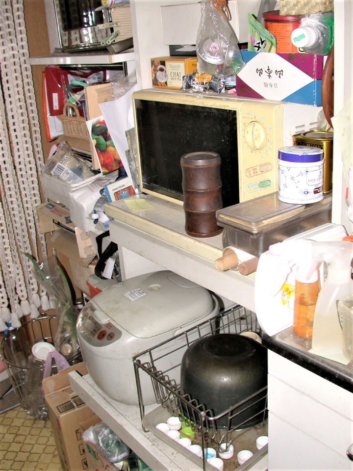 台所(リフォ-ム前):収納不足で物が溢れている