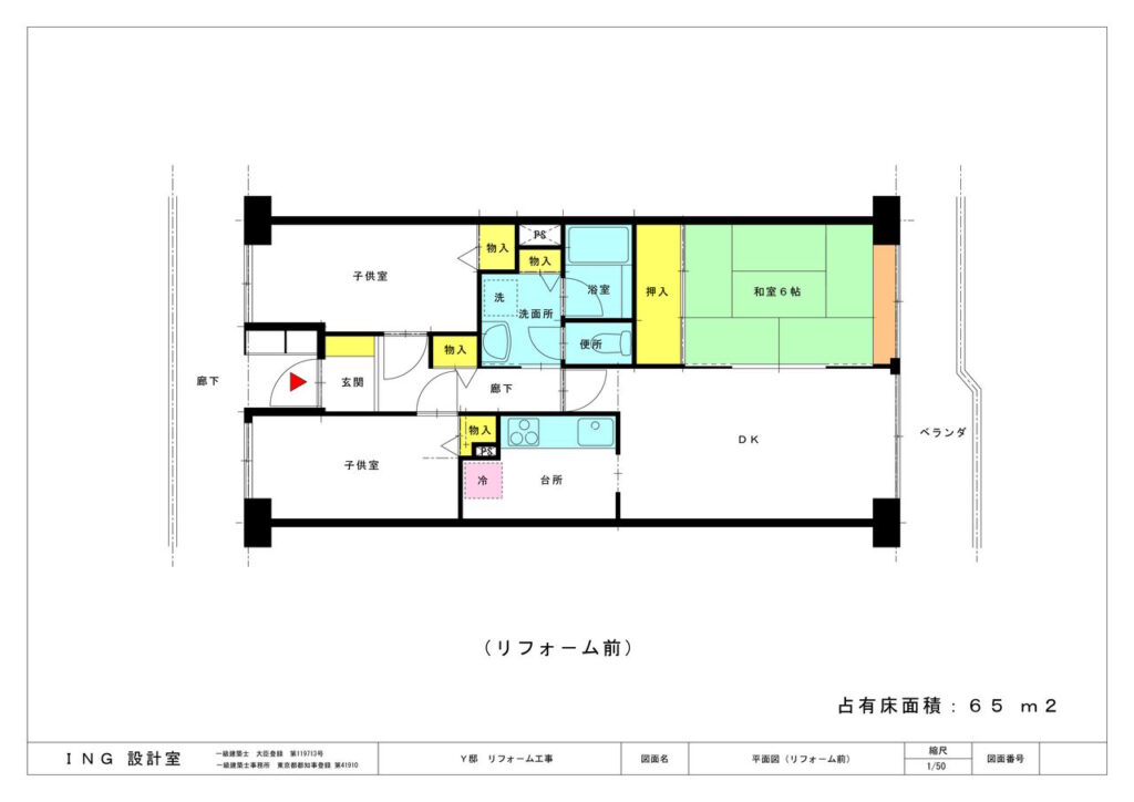 リフォーム前の問題点:動線・通風・外開きドア-・内装材・床の段差。収納不足