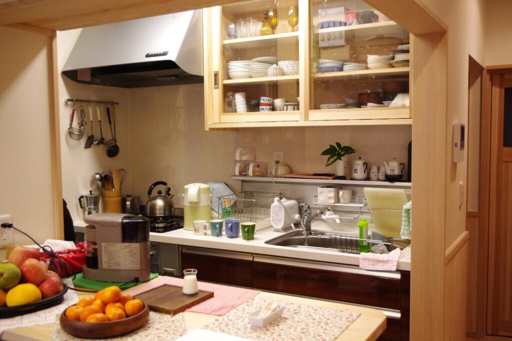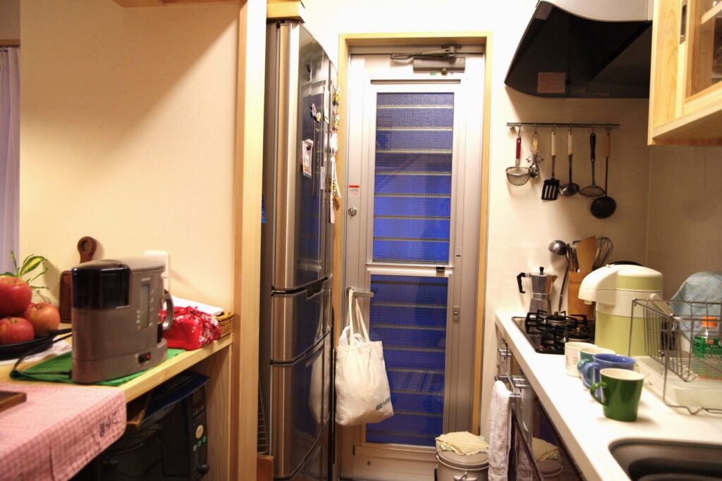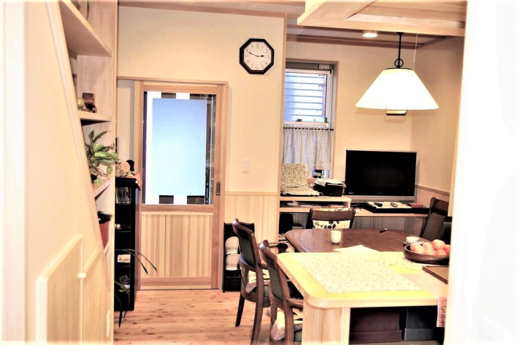 コンテンツ CONTENTS ホーム コンテンツ 狭小敷地の家 2025.08.20 狭小敷地の家 施工実績 新築事例 家族5人の二世帯住宅 敷地面積:(64.08m2)間口3間×奥行6.4間・1階(38.15m2)2階(38.15m2)ロフト(14.88m2) リビングダイニングから玄関への出入口引き戸は視線と風除け対策です リビングダイニング正面はTV・パソコンコナ-です 台所のカウンタ-(左側)と吊り食器戸棚(右側)は桧材で製作しました 台所の吊り食器戸棚は桧材で製作しました リビングダイニングの右奥2箇所の出入口は便所と洗面所用です 一覧へ戻る
